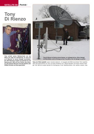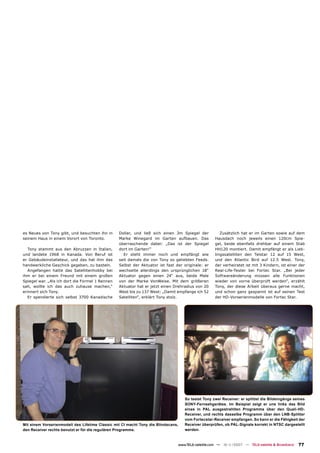 Tony Di Rienzo, ein Satellitenenthusiast aus Toronto, demonstriert seine beeindruckende Satellitenschüssel-Anlage mit mehreren Receivern und einem 3m Spiegel, um C-Band-Signale zu empfangen. Er testet die Fähigkeiten verschiedenen Receiver-Modelle, einschließlich eines Fortec Star Vorserienmodells, und hat durch seine handwerklichen Fähigkeiten umfangreiche Erfahrungen im Satellitenempfang gesammelt. Tony, der 1968 aus Italien nach Kanada kam, ist stolz darauf, 52 Satelliten empfangen zu können und zeigt die Unterschiede im Empfang von PAL- zu NTSC-signalen.