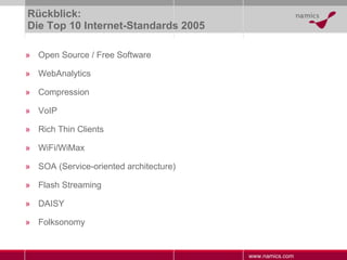 Das Dokument beschreibt die wichtigsten Internet-Standards für das Jahr 2006, darunter Desktop-Widgets, 2D-Barcoding und REST-Architektur. Es hebt die Bedeutung von Technologien wie Java Content Repository (JSR) und JSON für moderne Webanwendungen hervor und behandelt die Interaktion zwischen Mensch und Maschine in Bezug auf mobile Geräte und Widgets. Abschließend wird die Rolle von APIs und Mash-ups in der Entwicklung vernetzter Anwendungen und Datenintegration betont.