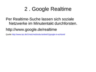Das Dokument listet verschiedene Tools für das Lernen auf, darunter Google Realtime, das soziale Netzwerke in Echtzeit durchsucht, und Google Video, das Millionen von Videos im gesamten Web findet. Es verweist auf spezifische Links für weitere Informationen. Diese Tools können nützlich sein, um schnell auf aktuelle Informationen und Videoinhalte zuzugreifen.
