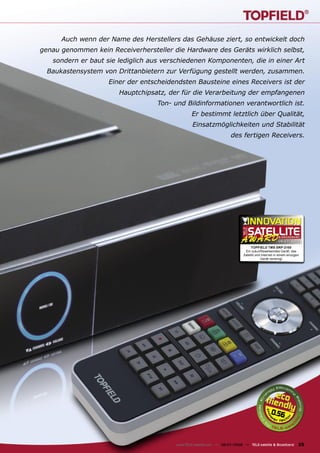 Der Testbericht beschreibt den Topfield TMS SRP-2100, einen hochentwickelten HD-Receiver, der Satelliten- und Internetempfang kombiniert und auf der neuesten DVB-S2/H.264-Technologie basiert. Mit einem überarbeiteten Design, verbesserten Anschlussmöglichkeiten und umfangreichen Funktionen, einschließlich einer benutzerfreundlichen Fernbedienung und flexibler Kanalsuche, bietet das Gerät eine hohe Verarbeitungsgeschwindigkeit und Stabilität. Der Test hebt die Möglichkeit hervor, bis zu 16 LNBs zu unterstützen und eine komfortable Bedienung durch Touchfeldsteuerung, USB-Anschlüsse sowie die Integration von Streaming-Optionen.