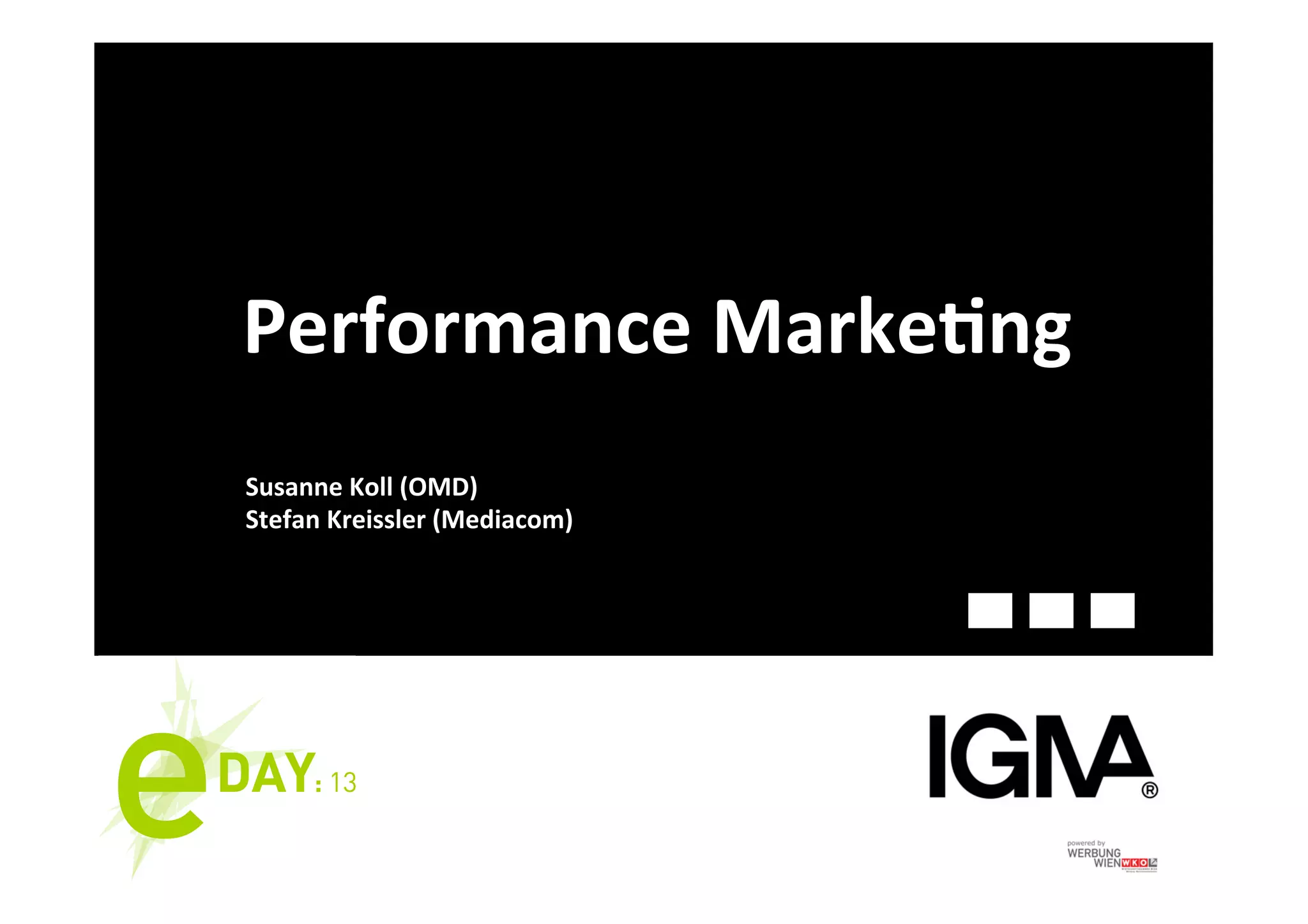 Das Dokument erläutert das Konzept des Performance Marketings, das sich auf die Generierung von Effizienz in der Werbung konzentriert, um die Sichtbarkeit in Suchmaschinen zu erhöhen. Es werden Strategien zur Optimierung von Online-Präsenzen, wie lokale Einträge und optimierte Landing Pages, hervorgehoben, um mehr Kunden zu gewinnen. Zudem wird die Relevanz von Suchmaschinenanzeigen und die Notwendigkeit, Ziele klar zu definieren, betont.