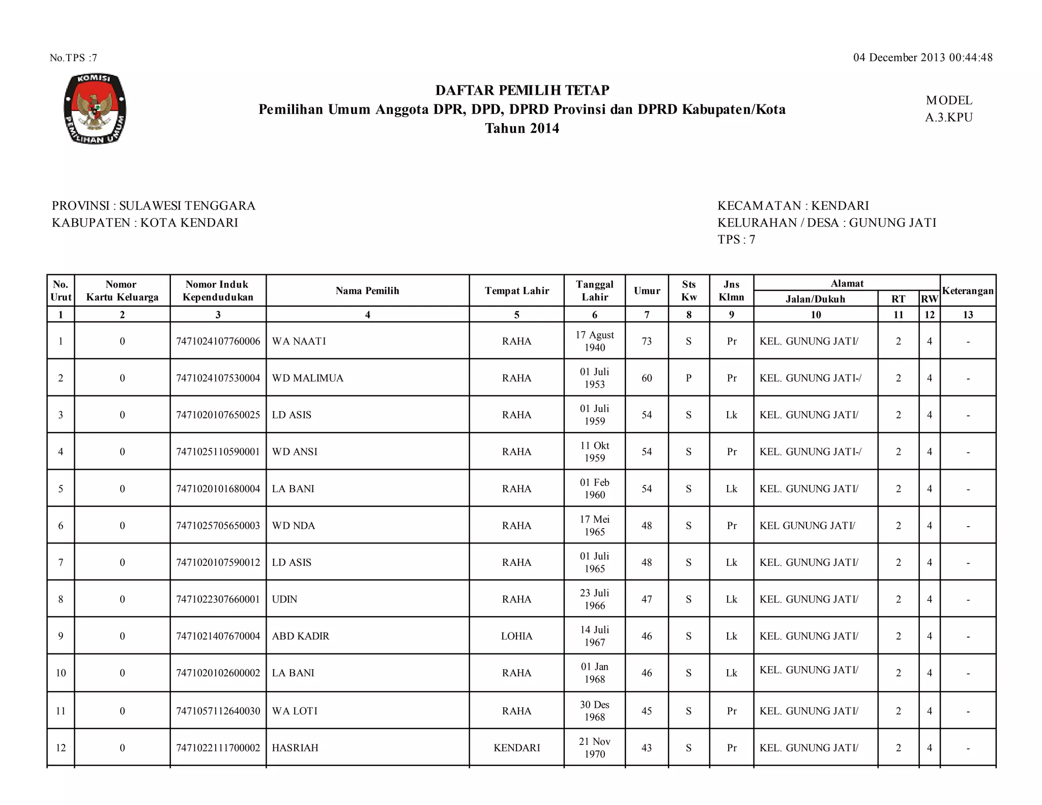 Das Dokument ist eine Wählerliste für die Wahlen 2014 in der Stadt Kendari, Provinz Sulawesi Tenggara. Es enthält Informationen zu den registrierten Wählern, einschließlich ihrer Personal ID, Geburtsdaten, Geschlecht und Wohnort. Die Liste umfasst sowohl männliche als auch weibliche Wähler unterschiedlichen Alters.