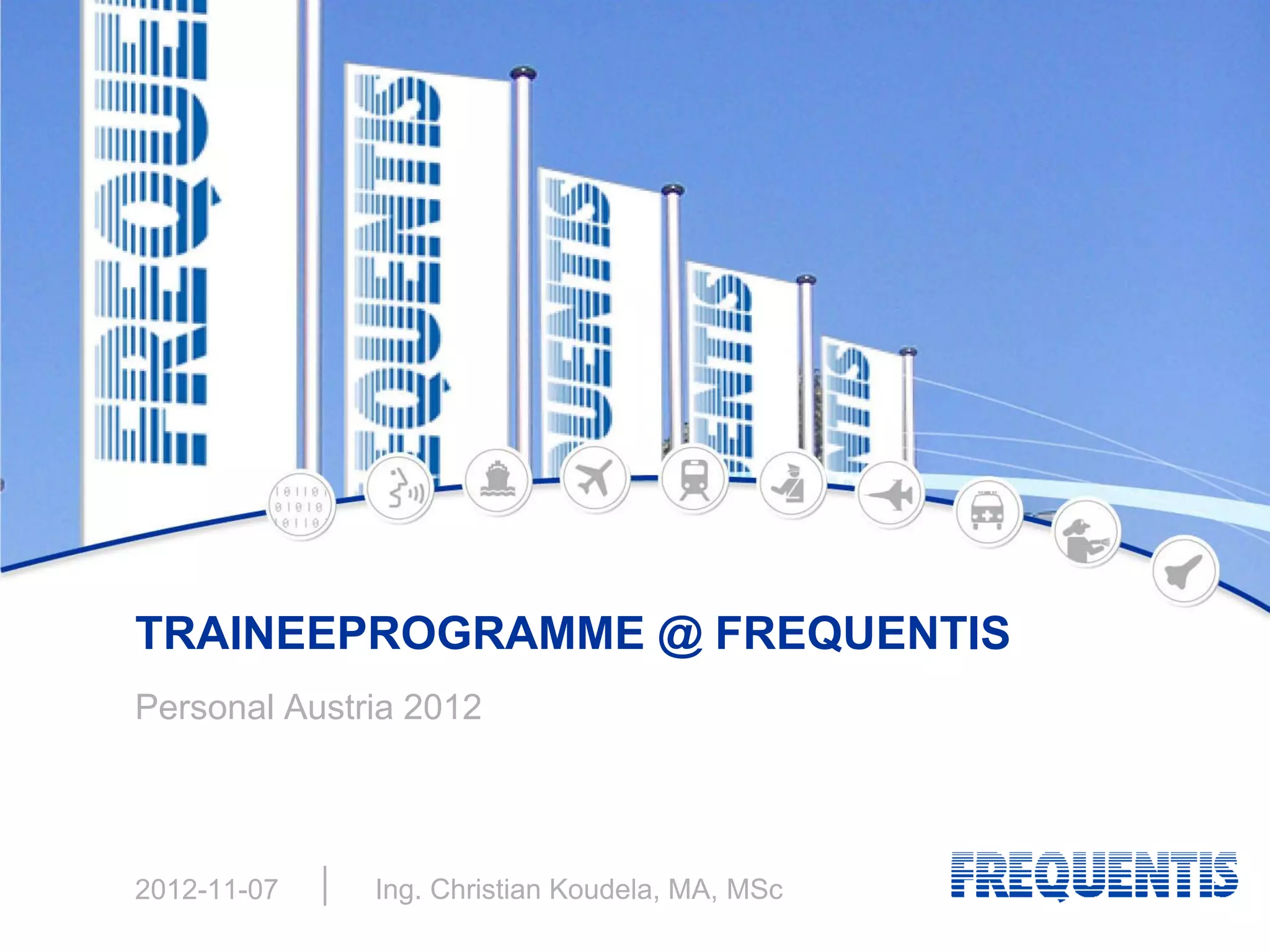 Das Dokument beschreibt die Traineeprogramme von Frequentis, einem Unternehmen, das auf die Entwicklung von Kommunikations- und Informationssystemen für sicherheitskritische Lösungen spezialisiert ist. Es erläutert die Struktur, Ziele und Elemente dieser Programme, die darauf abzielen, Hochschulabsolventen systematisch in Organisationen zu integrieren und auf zukünftige Aufgaben vorzubereiten. Das Training umfasst verschiedene Elemente wie Job-Rotation, Mentoring und spezialisierte Seminare, um sowohl Fach- als auch Managementkarrieren zu fördern.
