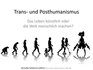 Das Dokument behandelt die Konzepte des Trans- und Posthumanismus, die die Überwindung der natürlichen menschlichen Bedingungen durch technologische Fortschritte anstreben. Es kritisiert die reduktionistischen Annahmen dieser Strömungen und plädiert für eine gesellschaftliche Veränderung, die den Menschen als ein gesellschaftliches Wesen betrachtet, anstatt ihn künstlich umzugestalten. Die Autorin fordert, die Welt menschlich zu gestalten, um ein harmonisches Zusammenleben mit intelligenten Maschinen zu ermöglichen.