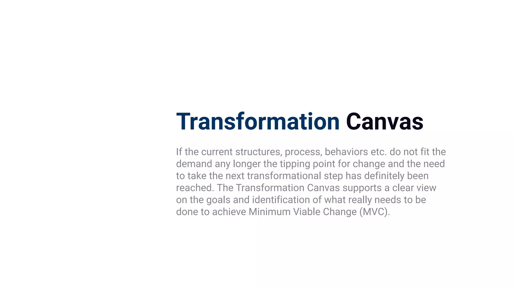 Das Transformation Canvas ist ein strukturiertes Werkzeug, das Organisationen dabei unterstützt, notwendige Veränderungen zu identifizieren und umzusetzen, wenn bestehende Strukturen und Prozesse nicht mehr den aktuellen Anforderungen entsprechen. Es umfasst mehrere Schritte, darunter die Analyse der Dringlichkeit, die Festlegung eines Zielzustands, die Entwicklung von Kommunikationsstrategien und die Definition von Erfolgskriterien. Ziel ist es, einen Minimum Viable Change (MVC) zu erreichen, um die angestrebten Veränderungen langfristig zu verankern.