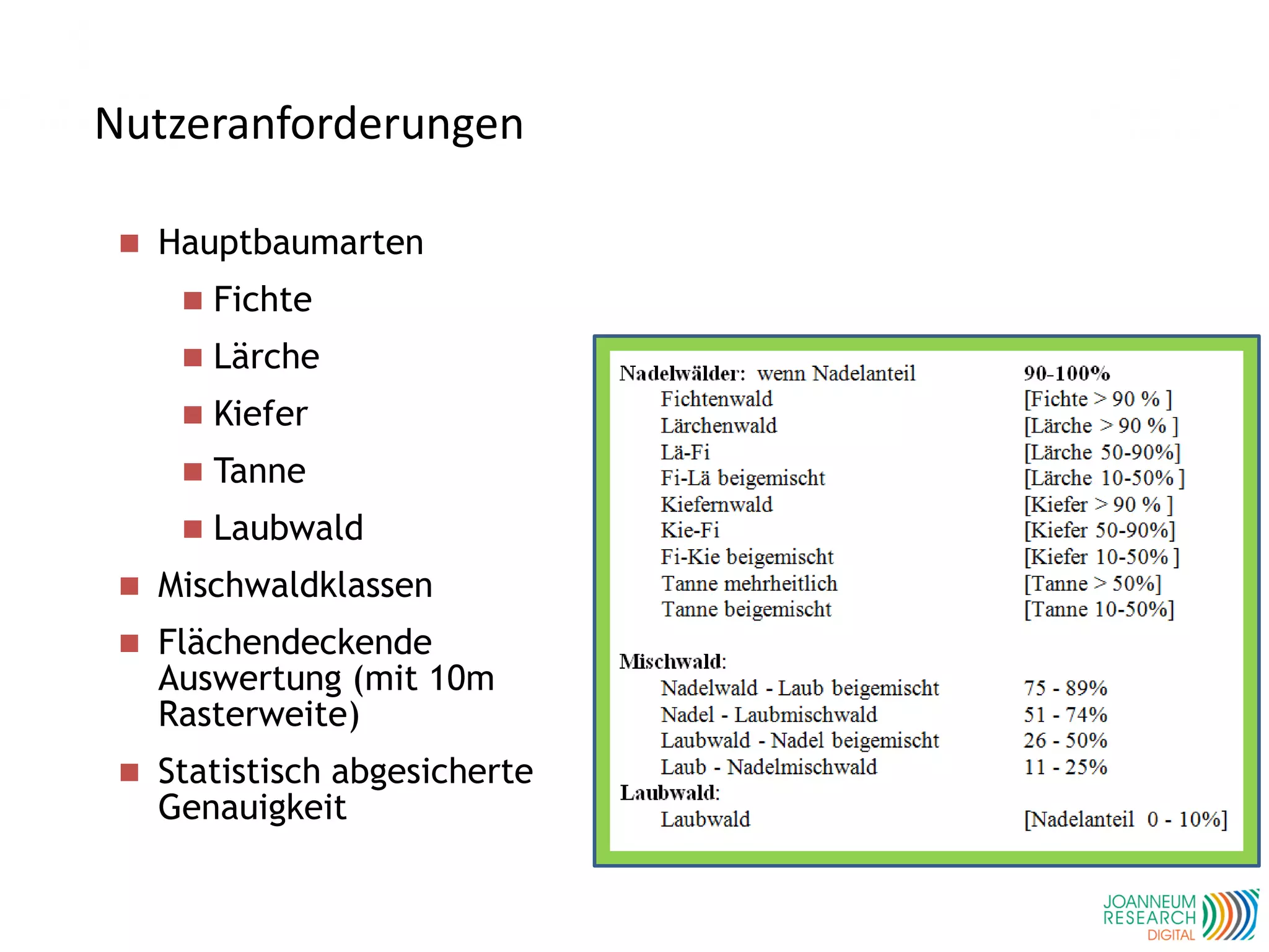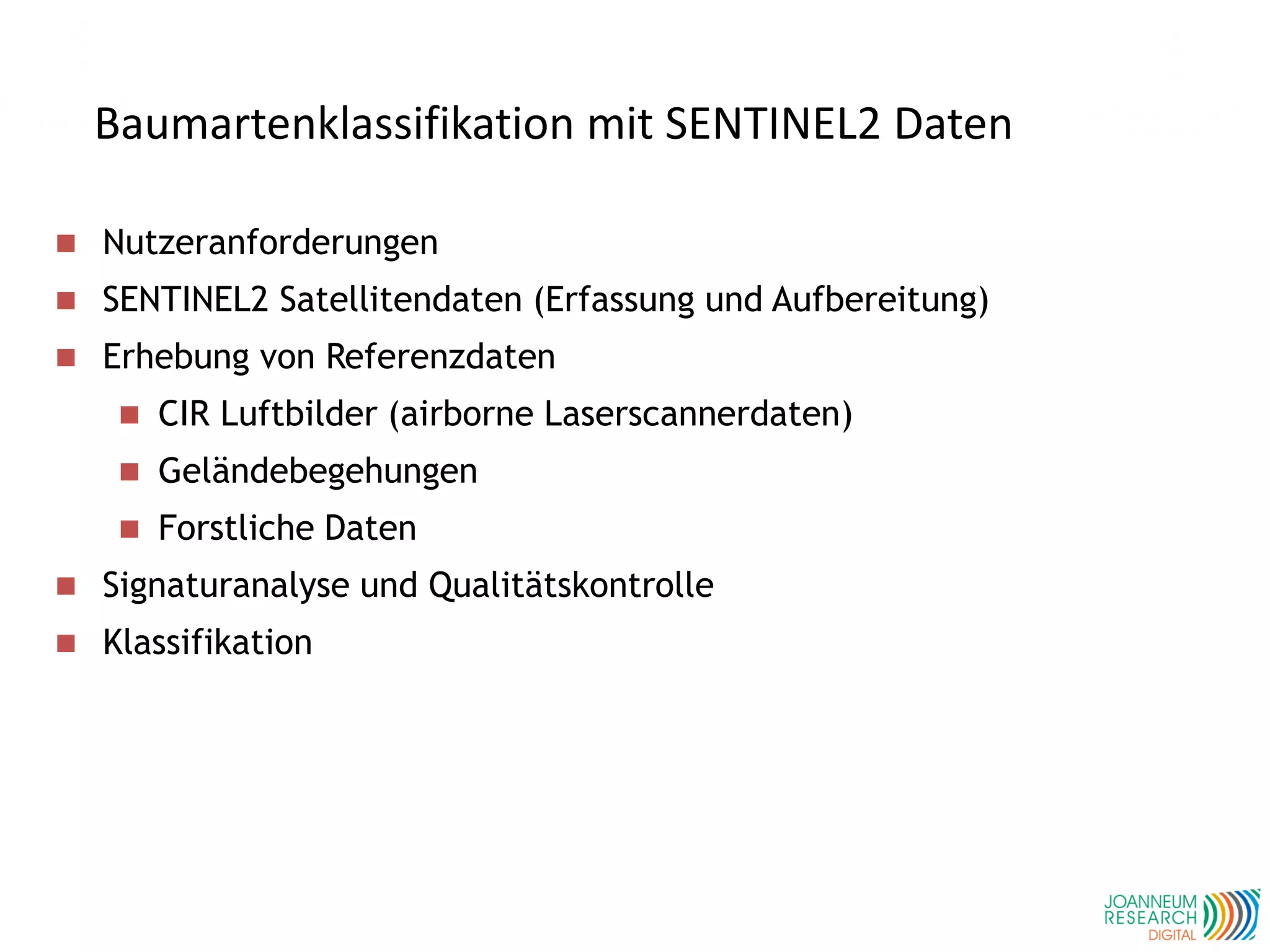 Das Dokument beschreibt die Klassifikation von Baumarten mithilfe von Sentinel-2 Satellitendaten, einschließlich der Nutzeranforderungen und der Erhebung von Referenzdaten. Es wird auf die technische Verarbeitung der Daten, wie atmosphärische und topografische Korrekturen, sowie auf die signaturanalyse und Klassifikationsmethoden eingegangen. Abschließend werden die anwendungsrelevanten Ergebnisse und deren Nutzung im Forstmanagement sowie in der Erstellung von Gefahrenhinweiskarten angesprochen.