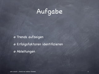 Das Dokument analysiert Trends und Erfolgsfaktoren im Bereich mobiler Anwendungen, insbesondere im Kontext der App-Wirtschaft. Es hebt hervor, dass erfolgreiche Apps oft als Dienste oder Ökosysteme fungieren, die die Bedürfnisse der Benutzer im Fokus haben und plattformübergreifende Lösungen bieten. Der 'Mobile First'-Ansatz wird als zukunftsweisend dargestellt, wobei APIs eine zentrale Rolle in der viralen Verbreitung und Erweiterung von Services spielen.