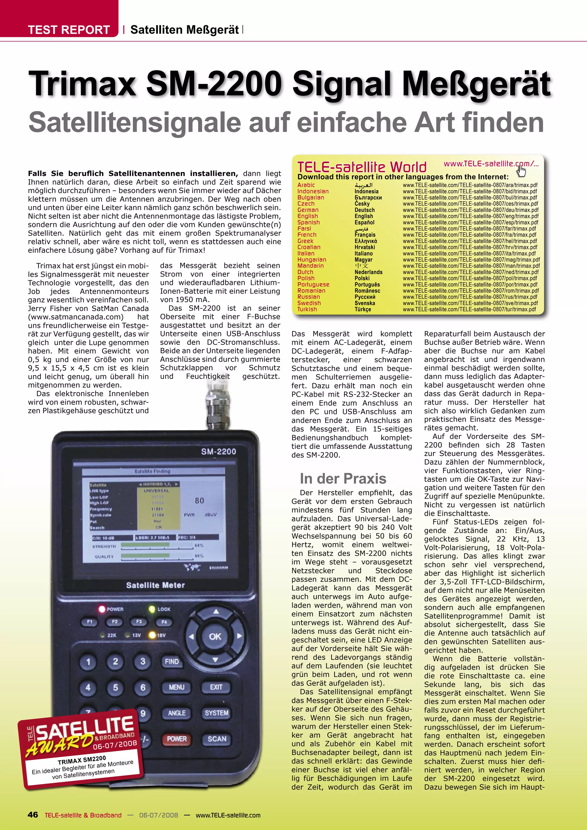 Der Trimax SM-2200 ist ein tragbares Satellitenmessgerät, das die Installation und Ausrichtung von Satellitenantennen erleichtert. Mit einem 3,5-Zoll TFT-LCD-Bildschirm und einem benutzerfreundlichen Menü ermöglicht es Antennenmonteuren, Satelliten schnell zu finden und einzurichten. Das Gerät ist leichtgewichtig, hat langlebige Batterien und unterstützt eine Vielzahl von Frequenzen und Systemkonfigurationen.