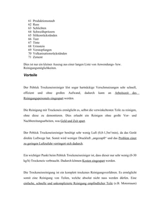 Der Peböck Trockeneisreiniger nutzt CO2-Pellets zur effektiven und umweltschonenden Reinigung von hartnäckigen Verschmutzungen, wobei die Reinigung in einem trockenen Zustand erfolgt und gleichzeitig eine Desinfektion der Oberflächen stattfindet. Die Methode spart Zeit und Kosten, da sie die Reinigungszeit um 50% reduziert und wenig Trockeneis sowie Luft verbraucht. Dank der kompakten Bauweise ist der Reiniger mobil und kann vielseitig in verschiedenen Bereichen, sowohl im Innen- als auch im Außenbereich, eingesetzt werden.