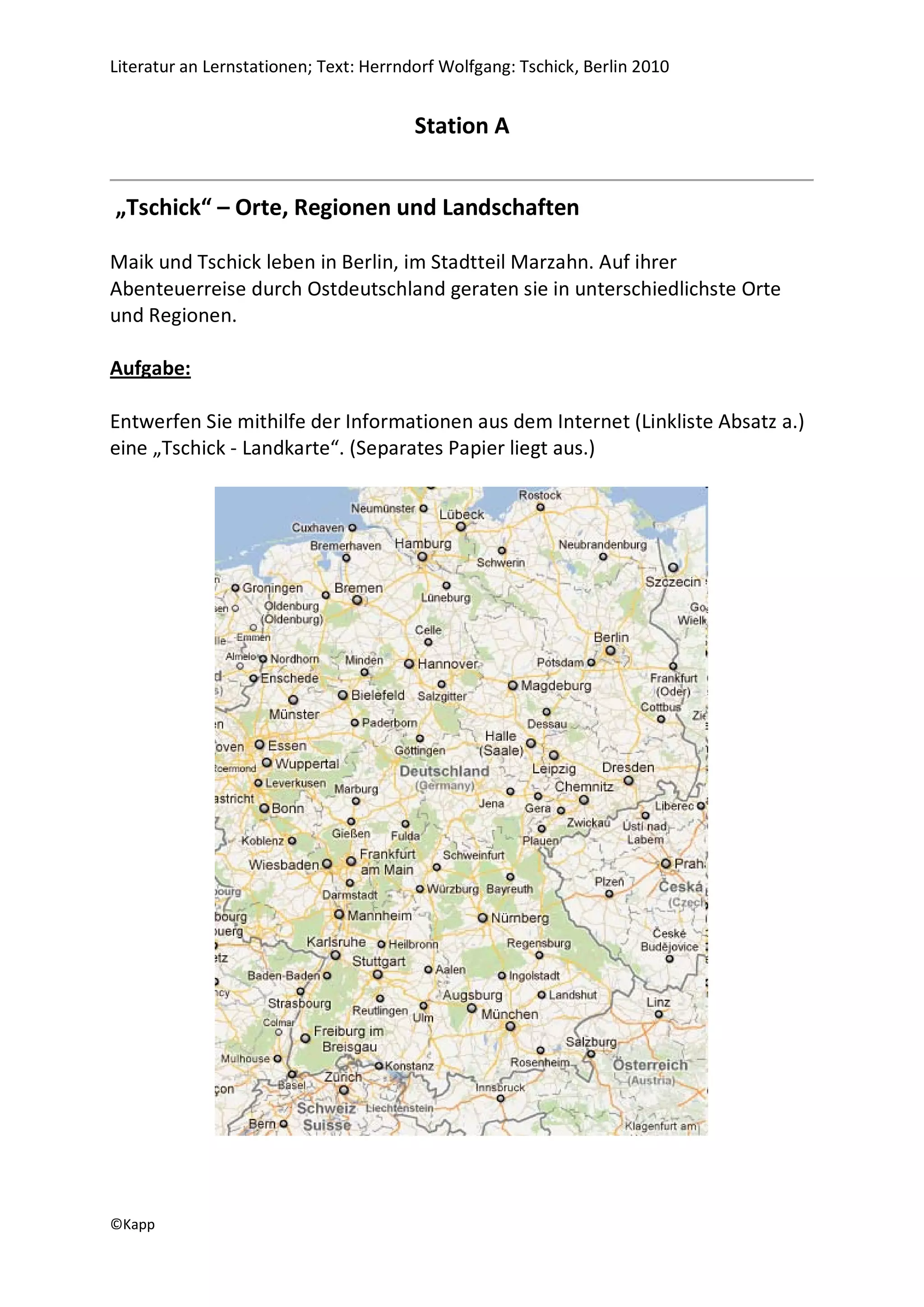 Das Dokument beschreibt verschiedene Stationen und Aufgaben zur Literaturanalyse des Romans "Tschick" von Wolfgang Herrndorf. In Gruppenarbeiten sollen die Schüler Aspekte wie die geografischen Orte, kulturelle Bezüge und die Rezeption des Romans erkunden und kreativ umsetzen. Es werden auch Informationen über den Autor gesammelt und diskutiert.
