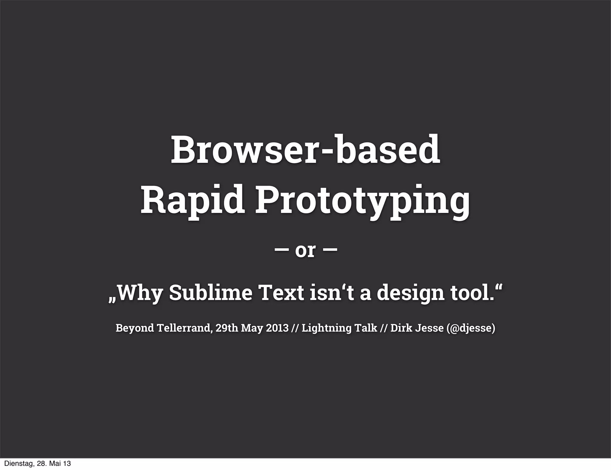 Der Vortrag 'Warum Sublime Text kein Design-Tool ist' thematisiert die Notwendigkeit eines iterativen Workflows für das Design und die Entwicklung, wobei eine gemeinsame Sprache zwischen Designern und Entwicklern betont wird. Der Referent kritisiert die Verwendung traditioneller Werkzeuge wie Photoshop für responsives Design und plädiert für neue, browserbasierte Prototyping-Tools. Zukünftige Schritte beinhalten die Integration von CSS-Importen und JavaScript in Prototypen.