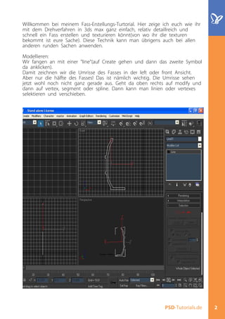 Das Dokument bietet ein detailliertes Tutorial zur Erstellung und Texturierung eines Fasses mit der Drehverfahrentechnik in Autodesk 3ds Max. Es beschreibt die Schritte zur Modellierung des Fasses, einschließlich der Verwendung von Linien und der Lathe-Funktion, sowie den Prozess der Texturierung mittels des Materialeditors. Am Ende wird empfohlen, das Modell anzupassen, um ein realistisches Aussehen zu erzielen, und es wird zusätzlich eine Werbung für Fotografie-Workshops und Tutorials beigemengt.