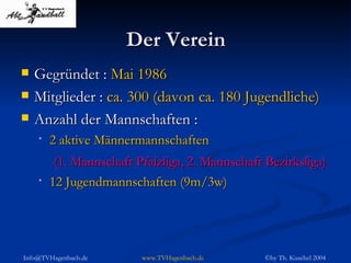 Der TV Hagenbach, ein Handballverein gegründet 1986, betreibt zwei aktive Männermannschaften und 12 Jugendmannschaften mit etwa 300 Mitgliedern. Die 1. Mannschaft hat in der Vergangenheit mehrere Auf- und Abstiege erlebt und die Jugendteams haben bedeutende Erfolge erzielt, einschließlich der Teilnahme an Deutschen Meisterschaften. Der Verein ist auf Sponsoren angewiesen, um die Kosten für den Spielbetrieb zu decken, und sucht aktiv nach Unterstützung durch Werbung und Spenden.