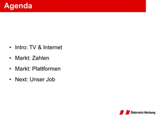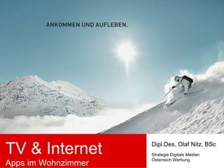 Das Dokument behandelt den aktuellen Stand und die Entwicklungen im Bereich TV- und Internet-Apps, einschließlich Marktanteilen, Nutzerzahlen und Plattformen. Es wird aufgezeigt, dass die Verbreitung und Akzeptanz von TV-Apps noch gering ist und der lineare TV-Konsum weiter abnimmt, während Inhalte zunehmend für TV optimiert werden müssen. Zudem wird die Notwendigkeit von Kooperationen mit bestehenden Anbieter und die Entwicklung eigener Formate hervorgehoben.