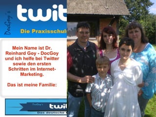 Dr. Reinhard Goy, ein Tierarzt, hat sich auf Internet-Marketing und Social Media spezialisiert und bietet Schulungen an, um anderen zu helfen, Kunden über Twitter und soziale Netzwerke zu gewinnen. Twitter wird als vielseitiges Informations- und Kommunikationsinstrument beschrieben, das einfach zu nutzen und mit anderen Plattformen zu vernetzen ist. Goy bietet eine Reihe von Tools und Dienstleistungen zur Automatisierung und Optimierung der Twitter-Nutzung an.