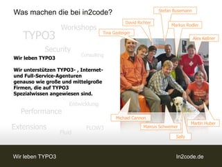 Das Dokument beschreibt die Aktivitäten und Beiträge des in2code-Teams, das Unterstützung für TYPO3, Internet- und Full-Service-Agenturen bietet. Es werden Workshops, Entwicklungen und Konzepte für die in2snippets-Erweiterung erwähnt, einschließlich der Notwendigkeit einer zentralen, kategorisierbaren Ablage. Weitere Aspekte sind die Verwendung von AJAX zur Verbesserung der Nutzererfahrung sowie Diskussionen über Performance und Sicherheit.