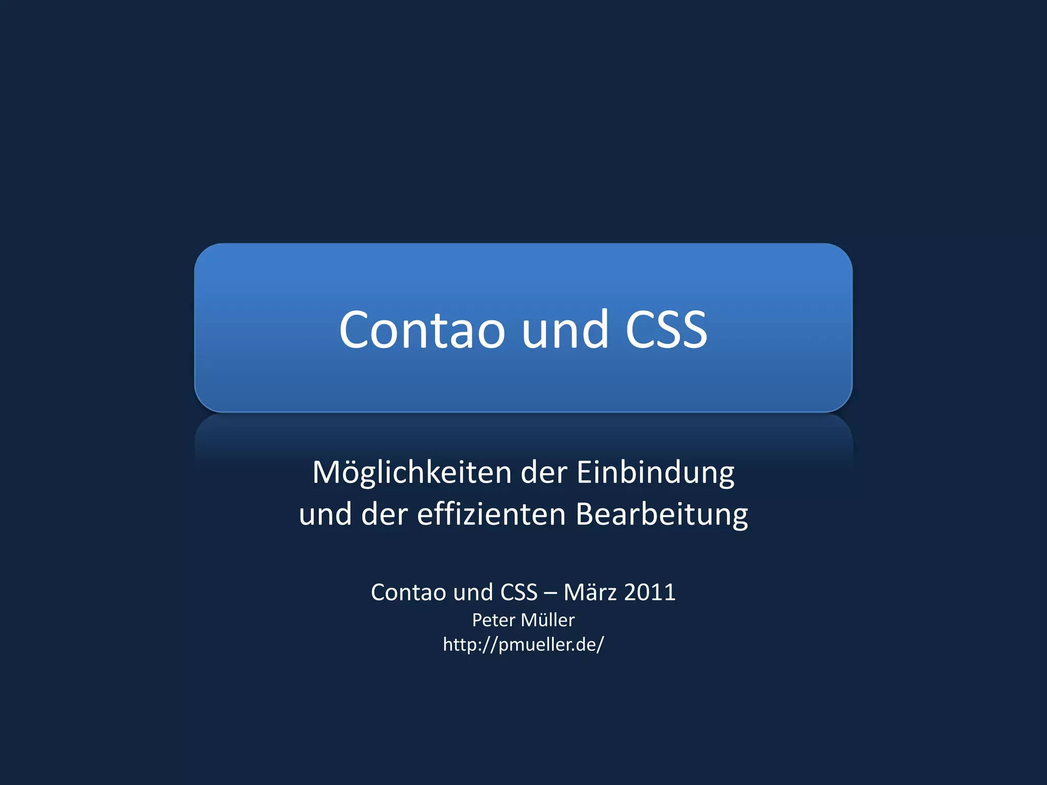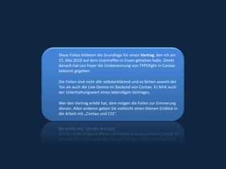 Das Dokument behandelt die Integration und effiziente Bearbeitung von CSS in Contao, einschließlich interner und externer Stylesheets sowie die Nutzung von CSS-Frameworks. Es umfasst praktische Hinweise zur Verwendung des internen CSS-Editors und erläutert Herausforderungen sowie Vorteile der verschiedenen Ansätze. Die Folien dienen als Gedächtnisstütze für einen Vortrag und bieten Einblicke in die administration von Stylesheets innerhalb des Contao-Systems.