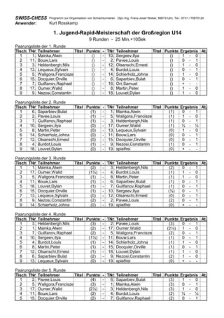 Das Dokument enthält die Ergebnisliste und Paarungen der 1. Jugend-Rapid-Meisterschaft der Großregion U14, die aus 9 Runden mit einer Bedenkzeit von 25 Minuten plus 10 Sekunden pro Zug besteht. In der Rangliste führt Louis Pavee mit 9 Punkten, gefolgt von Alwin Mainka mit 7 Punkten und Franciszek Waligora mit 6 Punkten. Zudem sind die Ergebnisslisten der ersten 9 Runden der Meisterschaft aufgeführt.