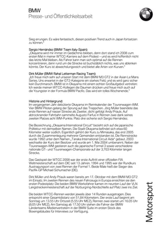 Die BMW Länderteams bereiten sich auf die Rennen 21 und 22 der FIA World Touring Car Championship in Okayama, Japan, vor und streben eine Aufholjagd im Titelkampf an. Aktuell liegt Augusto Farfus auf Platz drei in der Fahrerwertung und BMW benötigt gute Ergebnisse, um den Rückstand auf den Spitzenreiter zu verringern. Während des Events feiert auch die Asian Le Mans Series ihre Premiere in Okayama, was die Präsenz von BMW in der Region weiter stärkt.