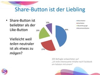 Eine Umfrage mit 230 Teilnehmern zeigt, dass der Share-Button beliebter als der Like-Button ist, da das Teilen neutraler erscheint. Die meisten Teilnehmer teilen Inhalte aus einer Laune heraus, wobei Facebook als Hauptplattform genutzt wird und die persönliche Empfehlung durch Freunde Vertrauen schafft. Zudem wünschen sich die Befragten attraktive Belohnungen für fundierte Empfehlungen.