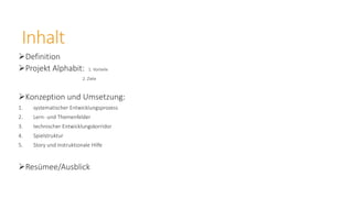 Das Dokument beschreibt die Entwicklung eines game-based Trainingsprogramms namens 'alphabit', das darauf abzielt, funktionalen Analphabeten in Deutschland und Österreich durch ein Lernspiel namens 'winterfest' schriftliche und rechnerische Kompetenzen zu vermitteln. Es werden die Vorteile des Projekts, die Ziele sowie der systematische Entwicklungsprozess und die Spielstruktur erläutert. Abschließend wird die Notwendigkeit weiterer Forschung zur Effektivität von Lernspielen für die Zielgruppe betont.