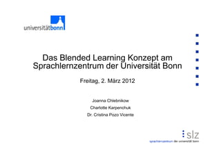 Das Dokument beschreibt das Blended Learning Konzept am Sprachlernzentrum der Universität Bonn, das die Kombination von Präsenzunterricht und Online-Lernangeboten umfasst. Es hebt die Kreativität der Lehrenden hervor und die Notwendigkeit freiwilliger zusätzlicher Arbeitszeiten, um den Studierenden eine effektive Lernumgebung zu bieten. Erste Ergebnisse der Testphase zeigen eine positive Wahrnehmung von Online-Phasen, die als wertvolle Unterstützung für individuelles Lernen diskutiert werden.