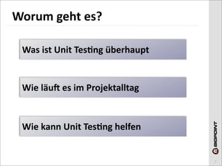 Das Dokument bietet einen Überblick über Unit-Testing, dessen Bedeutung für das Projektmanagement und wie es den Entwicklungsprozess verbessern kann. Es hebt die Wichtigkeit von Test-Driven Development, kontinuierlicher Integration und den Nutzen von Unit-Tests für die Qualität und Produktivität hervor. Zudem wird betont, dass Unit-Testing zu einer besseren Wartbarkeit und Transparenz beiträgt.