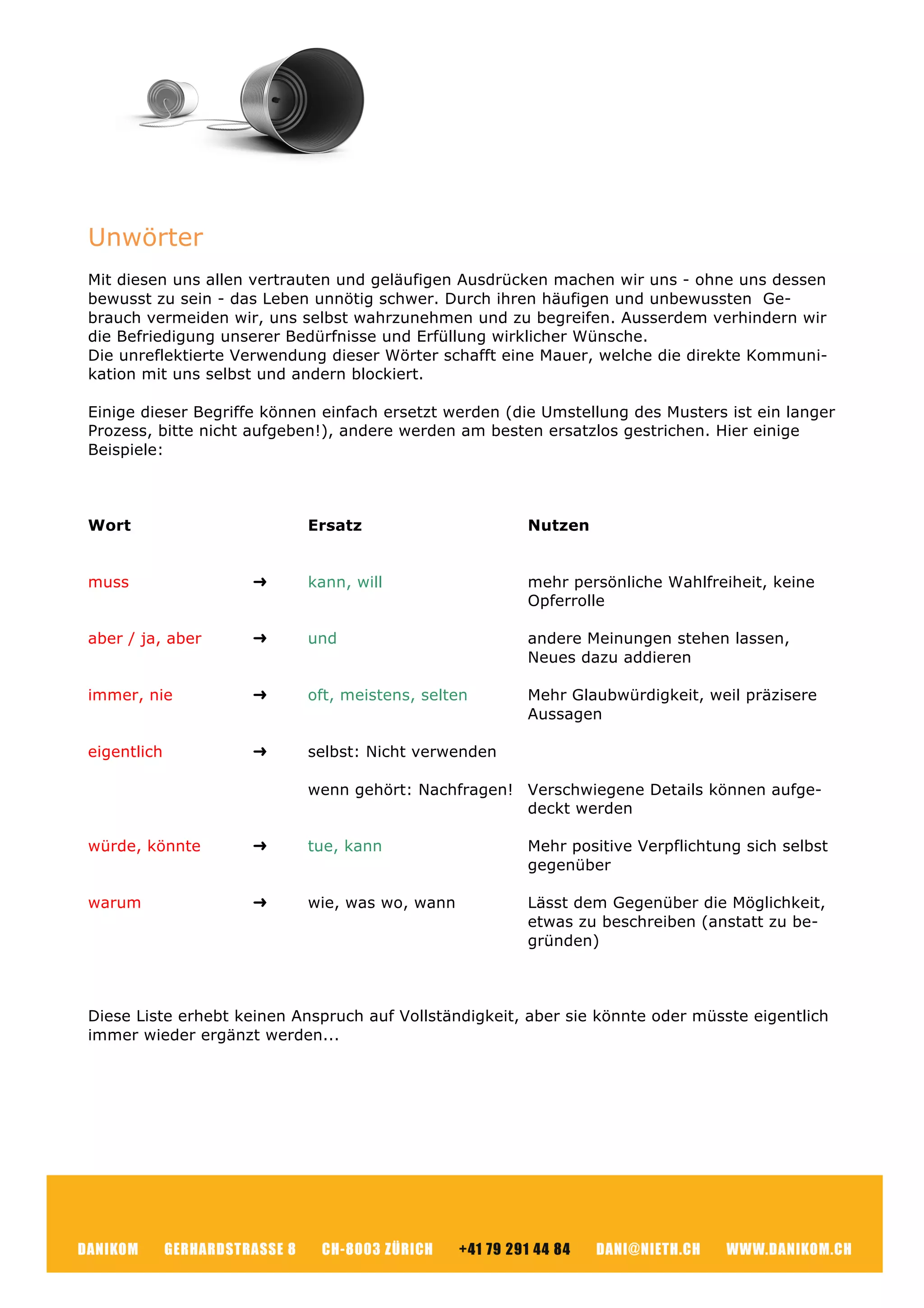 Die unreflektierte Verwendung bestimmter Wörter erschwert das Leben, indem sie die Selbstwahrnehmung und die Erfüllung von Bedürfnissen behindert. Die Ersetzung oder das Streichen dieser Begriffe kann die Kommunikation mit sich selbst und anderen verbessern. Beispiele für alternative Formulierungen werden gegeben, um den Umgang mit Sprache bewusster zu gestalten.