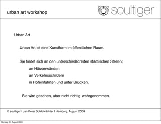 Der Urban Art Workshop ist eine kreative Veranstaltung, die sich mit der Kunstform Urban Art im öffentlichen Raum beschäftigt und den Teilnehmern ermöglicht, aktiv zu lernen und selbst zu gestalten. Der Workshop wird von Jan Peter Schildwächter organisiert und bietet exklusive Einblicke sowie eine Plattform für kreative Arbeiten. Zielgruppen sind sowohl Unternehmen als auch Einzelpersonen, die Interesse an der Urban Art-Szene haben.