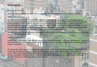Das Dokument beschreibt das Konzept des Urban Farming und Mining als Teil der Blue Economy, das darauf abzielt, nachhaltige Lebensmittelproduktion in städtischen Gebieten zu fördern. Dieser Ansatz nutzt vorhandene Ressourcen, um Lebensmittel in der Nähe der Verbraucher zu produzieren und eine hohe Biodiversität zu gewährleisten, während soziale und wirtschaftliche Vorteile geschaffen werden. Das Konzept zeigt erfolgreiche Beispiele für urbane Landwirtschaft in Verbindung mit Aquakultur und Kompostierung auf, die Arbeitsplätze schaffen und nachhaltige Praktiken in der Stadt fördern.
