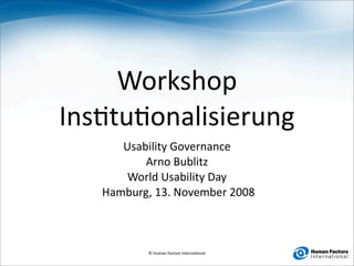 Das Dokument behandelt die Institutionalisierung von Usability in Unternehmen und betont die Bedeutung einer effektiven Governance dafür. Es werden Gründe für die Notwendigkeit sowie Hypothesen zu den Ursachen von schlechter Usability präsentiert, gefolgt von Vorschlägen zur Implementierung einer benutzerzentrierten Methodologie. Zudem wird die Rolle eines Executive Champions hervorgehoben, der für die Einführung und langfristige Unterstützung von Usability-Strategien entscheidend ist.