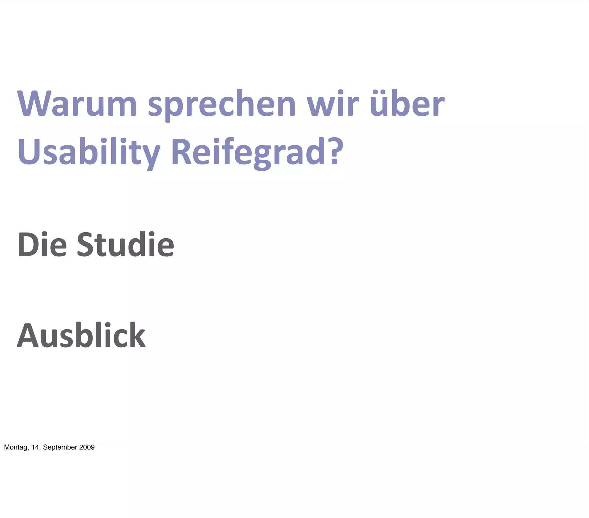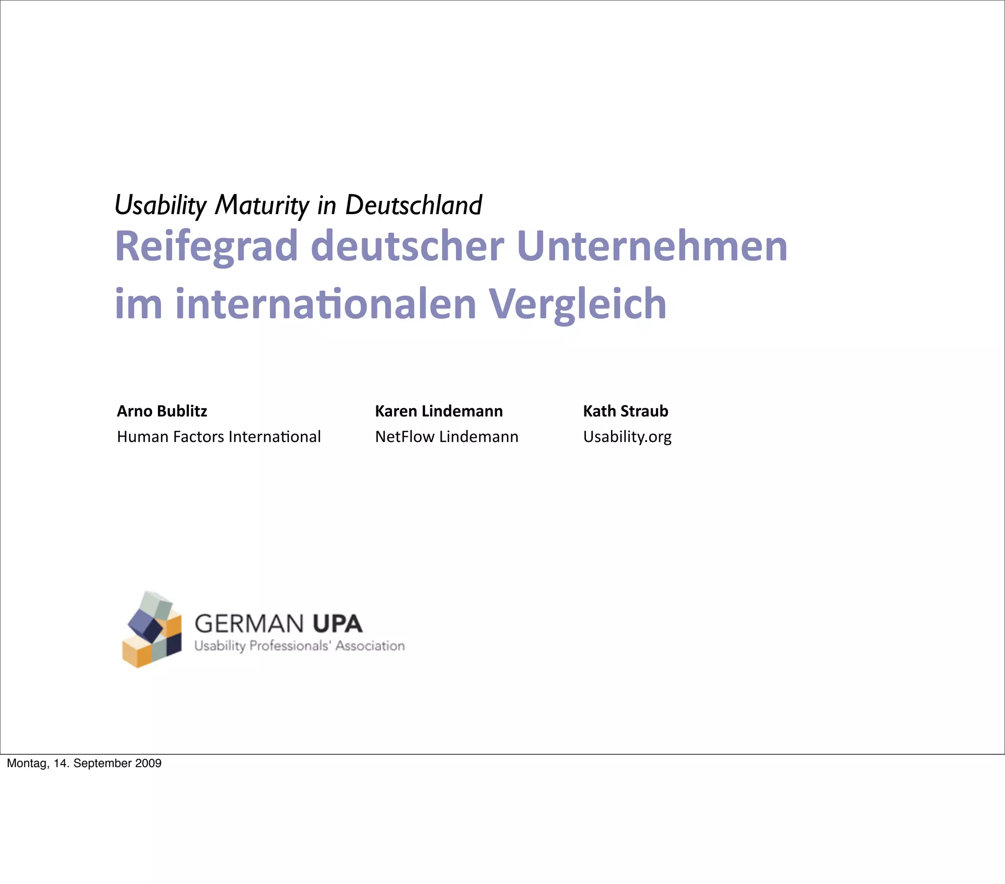 Die Studie zur Usability-Reife in Deutschland untersucht den aktuellen Stand und die Herausforderungen in Unternehmen im internationalen Vergleich. Der Fokus liegt auf der Bedeutung von User-Centered Design (UCD) und der Notwendigkeit, organisatorische Strategien zur Verbesserung der Usability zu etablieren, einschließlich der Rolle von Führungspersonen und dem Austausch von Wissen. Trotz der Erkenntnis über den Wert der Usability wird häufig eine zentrale Koordination und Strategie vermieden, was die Effektivität der Usability-Teams beeinträchtigt.