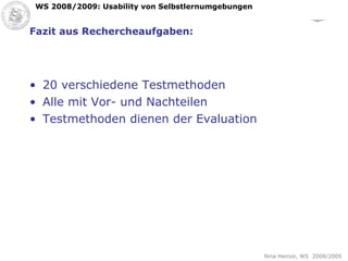 Das Dokument behandelt die verschiedenen Testmethoden zur Bewertung der Usability im Web 2.0, einschließlich ihrer Vor- und Nachteile. Es werden expertengestützte und benutzerorientierte Methoden vorgestellt, die sowohl während als auch nach der Produktentwicklung angewendet werden können. Zudem werden Usability-Tests für verschiedene Zielgruppen behandelt, um das Nutzererlebnis zu verbessern.