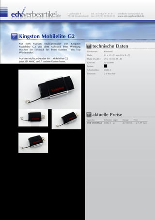 Das Dokument beschreibt den Kingston MobileLite G2, einen 9-in-1-Multi-Card-Reader als Werbeartikel, der personalisiert werden kann. Er hat die Maße 61 x 31 x 15 mm, ein Kunststoffgehäuse und unterstützt verschiedene Kartenformate über eine USB2.0-Schnittstelle. Der Artikel kostet ab 5,99 Euro bei einer Bestellung von mindestens 100 Stück, mit einer Lieferzeit von 2-3 Wochen.
