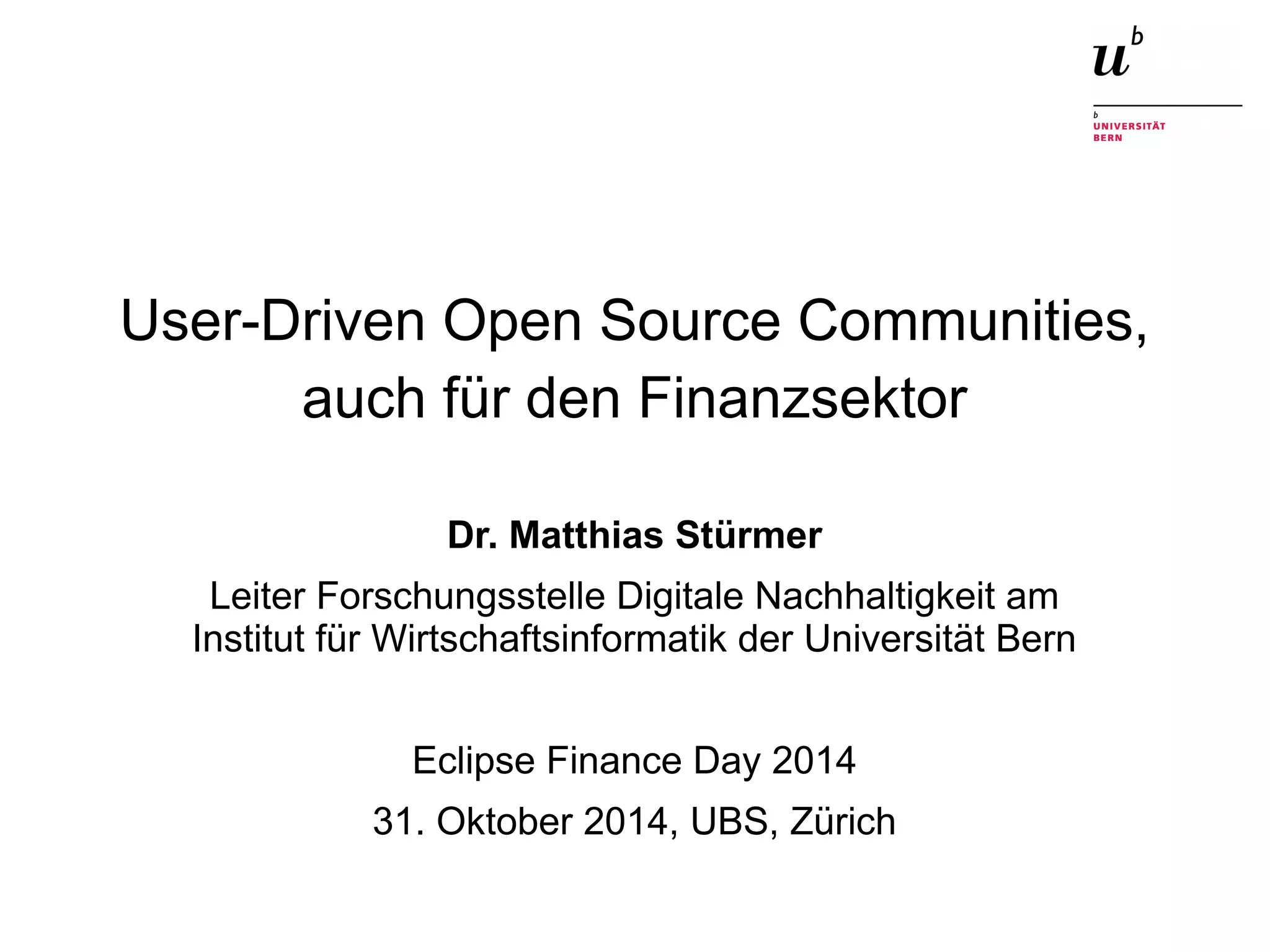 Dr. Matthias Stürmer erklärt in seiner Präsentation die Bedeutung und das Potenzial von benutzergetriebenen Open-Source-Communities im Finanzsektor, einschließlich Aspekte wie Community Governance und gemeinsame Softwareentwicklung. Er beschreibt verschiedene Anwendungsbeispiele aus dem öffentlichen und privaten Sektor sowie institutionelles Crowdfunding zur Unterstützung von Open-Source-Projekten. Die Forschungsstelle Digitale Nachhaltigkeit der Universität Bern spielt eine zentrale Rolle bei der Förderung dieser Themen.