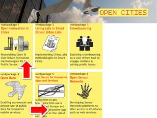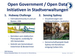 Das Dokument behandelt Open Government- und Open Data-Initiativen in Stadtverwaltungen, konzentriert sich dabei auf das Hubway-Fahrradverleihsystem in Boston und das Sensing Sydney-Kunstprojekt in Australien. Es hebt die Bedeutung datenvisualisierter Projekte hervor, die durch gemeinschaftliches Engagement und künstlerische Interpretationen von Sensordaten erfolgreich umgesetzt wurden. Die Herausforderungen für Wien in Bezug auf Smart Cities und die Sichtbarkeit als Forschungsstandort werden ebenfalls diskutiert.