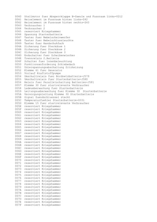 Das Dokument enthält eine umfangreiche Liste von Steuergeräten, Motorkomponenten, Sensoren und deren Funktionen sowie elektrische Schaltungen in einem Fahrzeug. Es werden spezifische Identifikatoren für verschiedene Teile, wie z.B. Stellmotoren, Temperaturfühler und Schalter, aufgeführt. Viele Einträge sind als reserviert markiert, was auf noch nicht definierte oder zukünftige Komponenten hinweisen könnte.