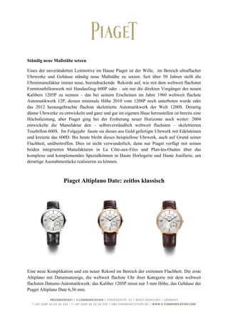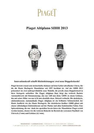 Auf der SIHH 2013 präsentiert Piaget die Altiplano Date und die skelettierte Altiplano, beide mit neuen Rekorden für extrem flache Automatikwerke. Das Altiplano Date, mit einem nur 3 mm hohen Werk und einem Gehäuse von 6,36 mm, ist die flachste Uhr ihrer Kategorie, während die skelettierte Version mit 259 Brillanten und einem Werk, das ebenfalls nur 3 mm hoch ist, höchste Uhrmacherkunst beweist. Mit diesen Modellen setzt Piaget weiterhin Maßstäbe in der Haute Horlogerie und Haute Joaillerie.