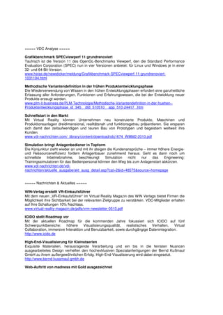 Der VDC Newsletter vom Juli 2010 informiert über Neuigkeiten und Veranstaltungen des Virtual Dimension Centers in Fellbach, darunter den Besuch einer EU-Expertengruppe, die Aufnahme neuer Mitglieder und Workshops zu 3D-Visualisierung und Marketing. Zudem werden zukünftige Kongresse und Projekte, wie der Virtual Efficiency Congress 2010 und das Access-Projekt, thematisiert sowie innovative Technologien und Produkte im Bereich der virtuellen Realität vorgestellt. Der Newsletter enthält auch Berichte über Kooperationen und Auszeichnungen von VDC-Mitgliedern sowie Forschungseinrichtungen.