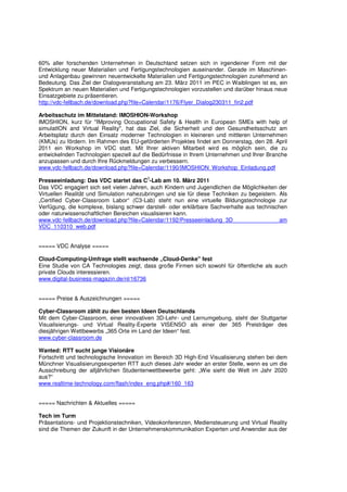Der VDC Newsletter vom Februar 2011 bietet Neuigkeiten zum Virtual Dimension Center in Fellbach, einschließlich der Ankündigung des Virtual Efficiency Congress, der am 29.-30. September 2011 stattfindet, sowie der Aufnahme neuer Mitglieder wie Lightshape und der Hochschule Albstadt-Sigmaringen. Zudem wird die Kooperation mit italienischen Technologie-Netzwerken sowie verschiedene bevorstehende Veranstaltungen und Angebote wie die Dialogveranstaltung zu neuen Materialien und der IMOSHION-Workshop erwähnt. Weiterhin werden aktuelle Entwicklungen im Bereich Virtual Reality und deren Anwendungen in Bildung und Industrie hervorgehoben.