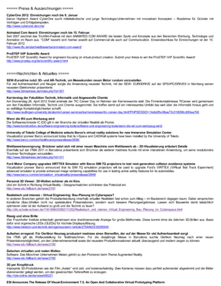 Der VDC Fellbach Newsletter informiert über Neuigkeiten im Bereich Virtual Engineering und enthält Berichte über den erfolgreichen Jahresbericht 2011, eine neue Website und bevorstehende Veranstaltungen wie den Fachkongress Composite Simulation. Zudem werden aktuelle Entwicklungen in der Virtual-Reality- und Softwarebranche sowie Wettbewerbe und Auszeichnungen angekündigt. Der Newsletter bietet auch Links zu externen Ressourcen und Neuigkeiten von Partnern und Firmen im Bereich Technologie und Innovation.