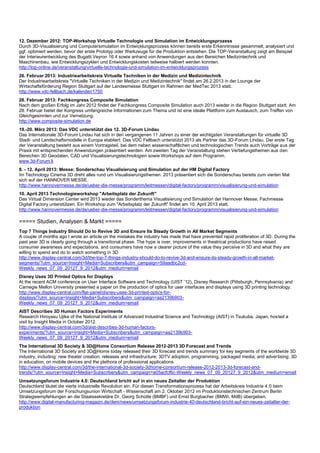 Der VDC Newsletter Oktober 2012 informiert über Neuigkeiten und Veranstaltungen des Virtual Dimension Centers Fellbach, darunter das Netzwerk VR-Textil-Technik und verschiedene industriearbeitskreise zu Themen wie virtuellen Fahrzeugen und medizinischen Technologien. Der Newsletter hebt auch die Unterstützung von VDC für den CyberOne 2013 Hightech Award und kommende Veranstaltungen bis April 2013 hervor, die sich auf 3D-Technologien und deren Anwendungen konzentrieren. Zusätzlich wird über wichtige Entwicklungen und Marktanalysen im Bereich 3D und Virtual Reality berichtet.