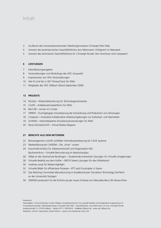 Das Virtual Dimension Center (VDC) Fellbach ist ein Kompetenzzentrum für virtuelle Engineering-Technologien, das seit 2002 erfolgreich die Zusammenarbeit zwischen kleinen und mittelständischen Unternehmen fördert. Es bietet Dienstleistungen in den Bereichen Beratung, Projektentwicklung und Netzwerkmanagement an und unterstützt seine Mitglieder bei der Einführung innovativer Technologien. Durch zahlreiche Veranstaltungen und Kooperationen mit regionalen sowie internationalen Partnern trägt das VDC zur Wettbewerbsfähigkeit der Unternehmen und zur Stärkung des Wirtschaftsstandorts Fellbach bei.