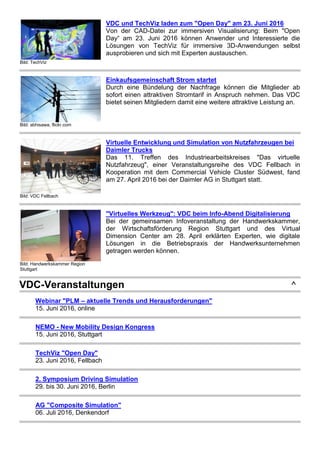 Der VDC-Newsletter Mai 2016 informiert über Neuigkeiten aus dem Virtual Dimension Center, darunter die Auszeichnung mit dem Forschungssiegel des Stifterverbandes und die Veröffentlichung eines Whitepapers über virtuelle Techniken im Handwerk. Weiterhin werden mehrere bevorstehende Veranstaltungen und Webinare sowie aktuelle Marktentwicklungen im Bereich Virtual Reality und Digitalisierung thematisiert. Zusätzlich werden interessante Unternehmensnachrichten und bevorstehende Termine in verschiedenen Bereichen vorgestellt.