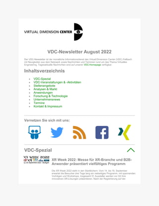 Der VDC-Newsletter August 2022 informiert über Neuigkeiten und Veranstaltungen im Bereich virtuelles Engineering, darunter die XR Week 2022 mit Vorträgen und Workshops sowie einen Tag der offenen Tür zu kollaborativen XR-Lösungen. Des Weiteren werden aktuelle Stellenangebote, Marktanalysen und innovative Anwendungsbeispiele von XR-Technologien präsentiert. Zudem gibt es Berichte über neue Entwicklungen in der AR- und VR-Technologie, einschließlich geplanter Produkte von Unternehmen wie Apple und Meta.