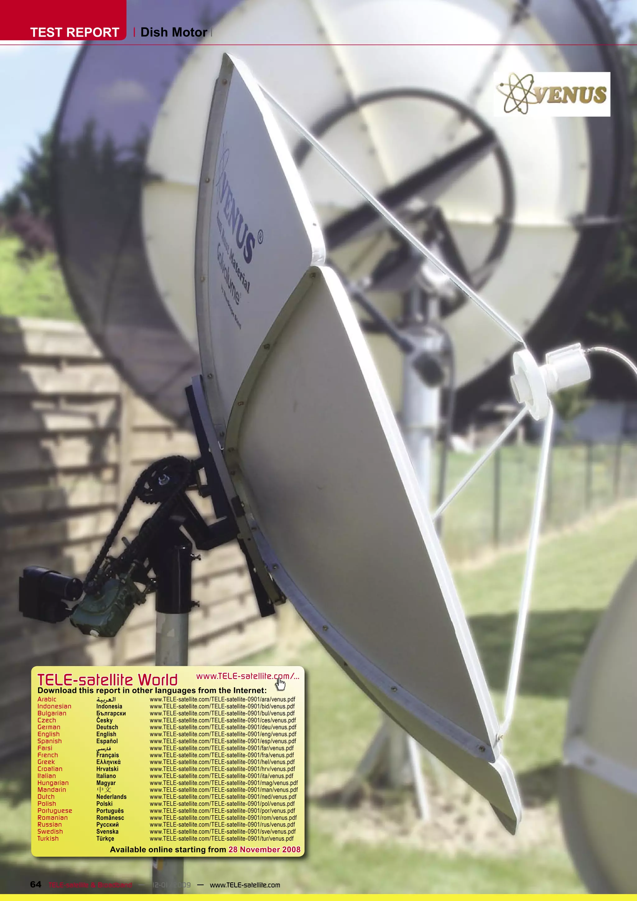 Der Testbericht bewertet den Venus-Motor von PT Subur Semesta aus Indonesien, der für große Satellitenspiegel konzipiert wurde und aufgrund seiner robusten Bauweise hohen Windlasten standhält. Der Motor ermöglicht eine Drehung von 180 Grad und wurde in Lyon getestet, wobei er eine Umstellung zwischen zwei Satellitenpositionen in 57 Sekunden bewältigen konnte. Empfohlen wird der Motor aufgrund seiner großen Stabilität und der einfachen Installation in Äquatornähe.