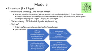 Das Dokument beschreibt ein Verkaufstraining, das auf individuellen Bedürfnissen basiert und verschiedene Module beinhaltet, darunter Rhetorik, Verkaufsphasen und Konfliktmanagement. Es betont die Bedeutung von Vorbereitung, Selbstmotivation und teamorientiertem Arbeiten sowie den Umgang mit Reklamationen als Chance zur Verbesserung. Praktische Übungen und Reflexionen sind ebenfalls Teil des Trainings, um das Gelernte nachhaltig zu verankern.