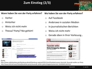 Das Dokument behandelt die eskalierte Facebook-Geburtstagsparty von Thessa am 3. Juni 2011, die ungebetene Gäste anzog, was zu mehreren Festnahmen führte. Es enthält auch Informationen zur Rolle von sozialen Medien und Internetnutzung in der Gesellschaft. Zudem wird auf die Entwicklung von Webpräsenz und die Bedeutung von Vernetzung im digitalen Zeitalter hingewiesen.