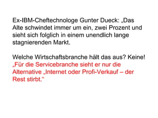 Das Dokument diskutiert den Rückgang der Hotline-Anbieter und die Herausforderungen der Call-Center-Branche in der digitalen Revolution, in der Kunden schnelle, personalisierte und effektive Services erwarten. Experten betonen die Notwendigkeit, sich auf moderne Technologien und die Internetökonomie zu konzentrieren, da Deutsche Anbieter hinter amerikanischen Wettbewerbern zurückbleiben. Der Artikel kritisiert die stagnierende Entwicklung in der deutschen Wirtschaft und die unzureichenden Anstrengungen im Bereich des Kundenservice.