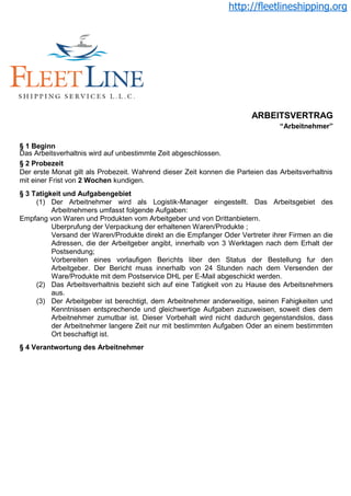 Der Arbeitsvertrag regelt ein unbefristetes Arbeitsverhältnis als Logistik-Manager mit einer einmonatigen Probezeit. Der Mitarbeiter hat eine wöchentliche Arbeitszeit von 12 Stunden und erhält nach der Probezeit ein Gehalt von 1000 EUR sowie eine Vergütung für versendete Pakete. Auch nach Beendigung des Arbeitsverhältnisses bleiben bestimmte Verpflichtungen, wie Verschwiegenheit und Verantwortung für Waren, bestehen.